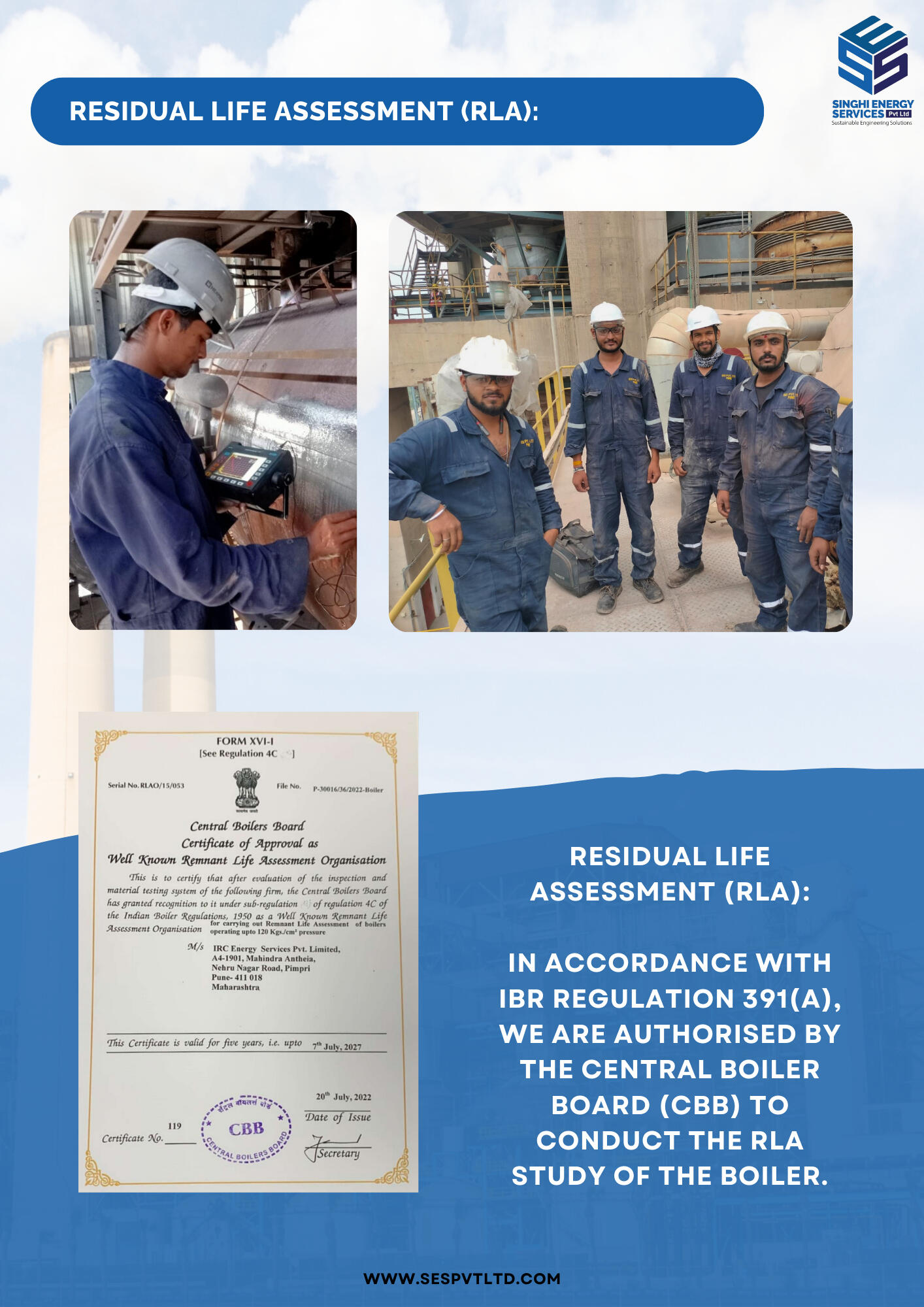 SES is certified by Central Boiler Board to carryout RLA as per IBR regulation – 391 A.